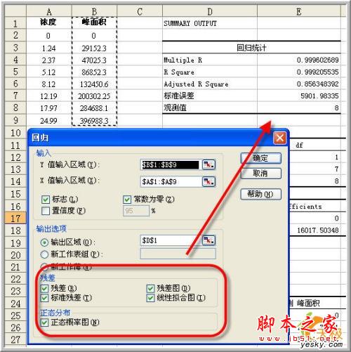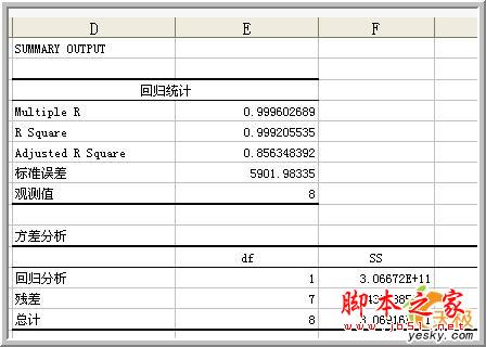 为了进一步使用更多的指标来描述这一个模型,我们使用数据分析中的“回归”工具来详细分析这组数据。