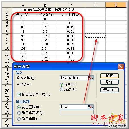 可以看到,在相应区域生成了一个3×3的矩阵,数据项目的交叉处就是其相关系数。显然,数据与本身是完全相关的,相关系数在对角线上显示为1;两组数据间在矩阵上有两个位置,它们是相同的,故右上侧重复部分不显示数据。左下侧相应位置分别是温度与压力A、B和两组压力数据间的相关系数。