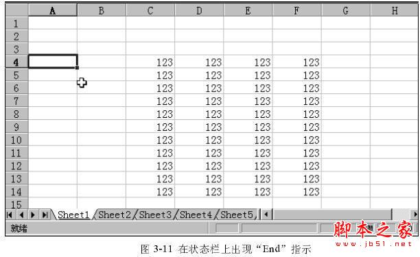 细心的读者可能已经从上面的表格中发现,对于一些组合键我们使用了逗号“,”,而另外我们使用了加号“+”,这里存在着什么不同呢?下面我们就将做出解释。在这里,对于“,”,我们以[End]键为例,来说明其特别的用法。首先在工作表上键入如图3-11所示的数据系列。单击单元格“A4”。按下[End]键,我们会在状态栏上看到“End”指示。