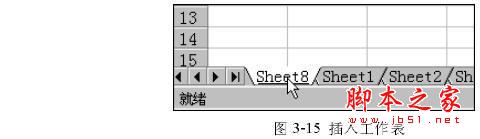 若要插入一张工作表,首先单击工作表选项卡来选定工作表,然后选择“插入”菜单中的“工作表”命令,我们就会看到一张新的工作表被插入,同时被命名为“Sheet8”(我使用的工作簿已经是7个工作表了),如图3-15所示。同时,新插入的工作表变成了当前活动工作表。