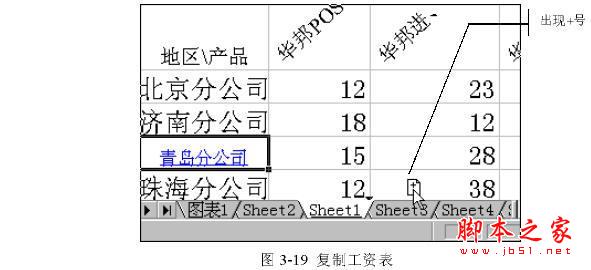 要在一本工作簿中复制工作表,只需在工作表选项卡上单击选中的工作表选项卡,然后按下[Ctrl]键,并沿着选项卡行拖动选中的工作表到达新的位置,之后松开鼠标键即可将复制的工作表插入到新的位置。在拖动过程中,屏幕上会出现一个黑色的三角形,来指示工作表要被插入的位置,如图3-20所示。
