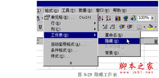 (2) 执行“格式”菜单中的“工作表”命令中的“隐藏”命令(如图3-25所示),我们可以看到选定的工作表从屏幕上消失。