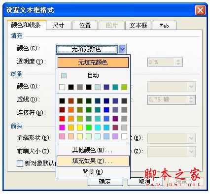 步骤一、首先插入一个文本框,然后双击这个文本框进入【设置文本框格式】进行设置,选择填充中的【颜色】进行填充,选择【填充效果】,如图所示: