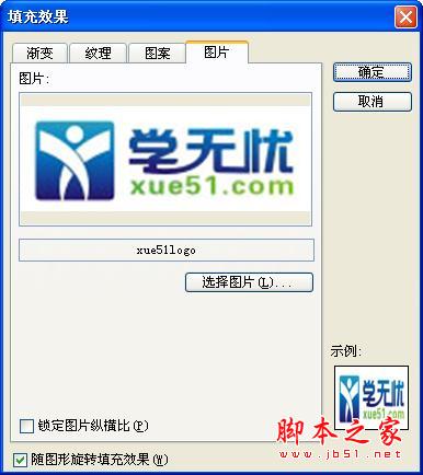 步骤二、进入【填充效果窗口】后,然后选择【图片】选项卡,再点击【选择图片】(找到图片文件),点确定按钮返回设置文本框格式,如图:
