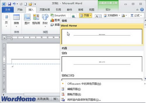 Word2010中的库主要集中在“插入”功能区,用户也可将自定义的设置添加到特定的库中,以便减少重复操作。下面以在页眉库中添加自定义页眉为例,操作步骤如下所述: