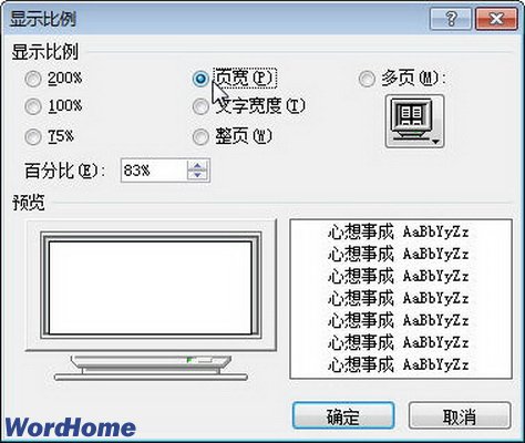 第2步,在打开的“显示比例”对话框中,用户既可以通过选择预置的显示比例(如75%、页宽)设置Word2010页面显示比例,也可以微调百分比数值调整页面显示比例,如图2所示。