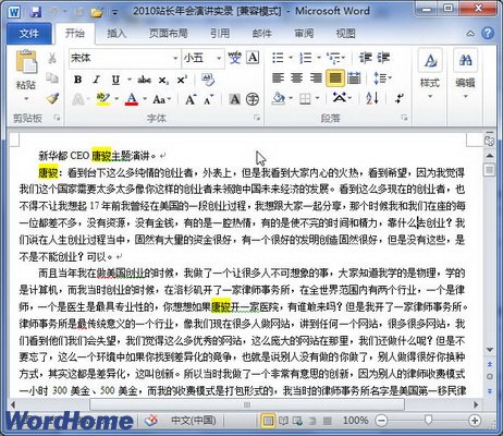 第3步,可以看到所有查找到的内容都被标识以黄色矩形底色,并且在关闭“查找和替换”对话框或对Word2010文档进行编辑时,该标识不会取消。如果需要取消这些标识,可以选择“阅读突出显示”菜单中的“清除突出显示”命令,如图2010081203所示。