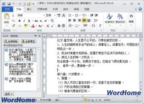 第2步,在打开的Word2010“剪贴板”任务窗格中可以看到暂存在Office剪贴板中的项目列表,如果需要粘贴其中一项,只需单击该选项即可,如图2所示。
