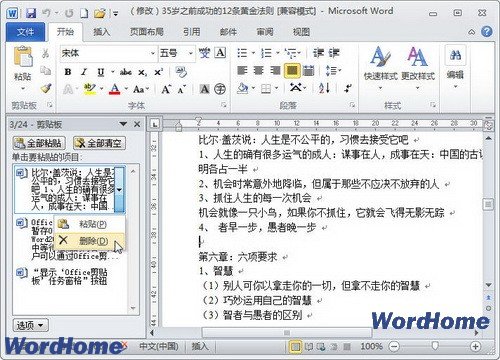 小提示:如果需要删除Office剪贴板中的其中一项内容或几项内容,可以单击该项目右侧的下拉三角按钮,在打开的下拉菜单中执行“删除”命令,如图3所示。