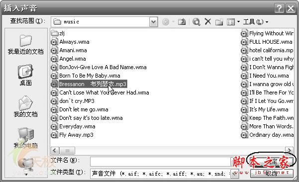 注:1.第一种方法支持较多类型的声音格式文件,但声音文件并没有内嵌到文档当中,因此要将文档移动到别的机器上时,对应的音乐文件也要移动,且相对路径不能错,因此建议采用此方法的同时将背景音乐文件和文档放在同一目录,这样便于移动后不容易出错。