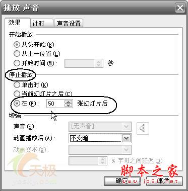 3.在弹出的“播放声音”对话框中,在“效果”标签中,在“停止播放”项下面选中“在(F):XX 张幻灯片之后”(中间XX为数字),在中间的数字增减框中输入适当的数字(图6)。