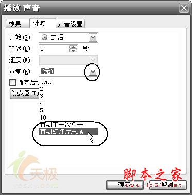 如果插入的声音文件比较短,可以切换到“计时”标签,在“重复”后面的下拉列表框中选中“直到幻灯片末尾”项(图7),这样就可发避免因为声音文件太短,导致演示到后来没有背景音乐的情况的发生。