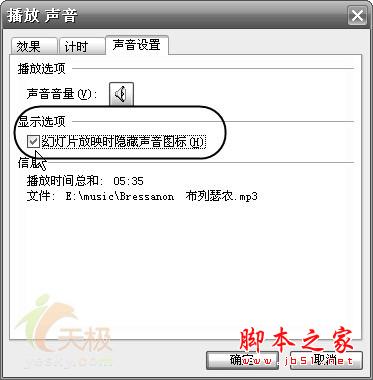 另外别忘了,切换到“声音设置”标签,勾选“幻灯片放映时隐藏声音图标”项(图8),这样在放映的时候小喇叭图标就不会显示了。