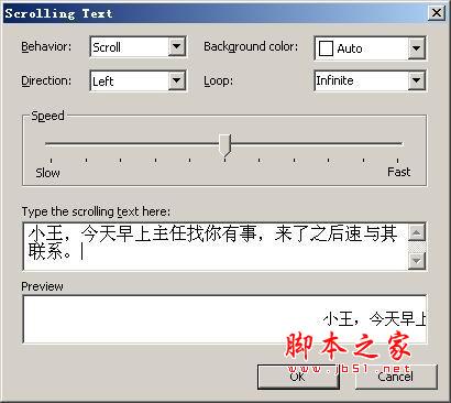 启动Word后,打开“视图”菜单下的“工具栏”,从中选择“Web工具箱”,单击打开的“Web工具箱”工具栏上的“滚动文字”按钮(图4),在打开的“Scrolling Text”窗口中进行设置。其中“Behavior”设为“Scroll”(滚动);“Background Color”为背景颜色,可打开下拉菜单进行选择;“Direction”表示滚动方向,“Left”表示右向左;“Loop”为循环滚动的次数,“Infinite”表示不限次数;“Speed”是滚动速度,越向右速度越快;做好这些设置后,我们就可以在“Type the scrolling text here”窗口中输入滚动的消息内容了(图5)。做好内容后单击“OK”按钮返回Word主界面,然后选中滚动文字对象,根据需要改变其显示位置,以及对页面进行美化。