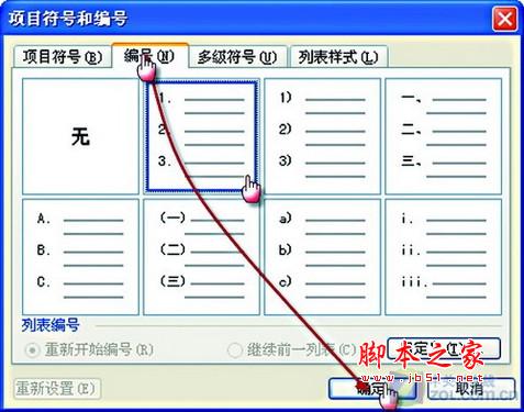 点击“格式”菜单中的“项目符号与编号”命令,在弹出的“项目符号与编号”窗口中的“编号”标签下,选中合适的编号类型后点击“确定”。