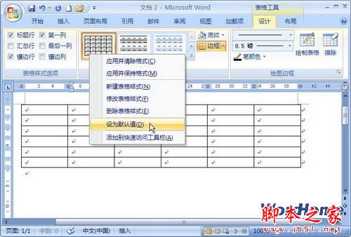 第1步,打开Word 2007文档窗口,首先插入任意格式的表格。单击新建的表格,在打开Word 2007“表格工具”功能区中切换到“设计”选项卡。然后在“表样式”分组中右键单击任意表格样式,选择“设为默认值”命令,如图所示。