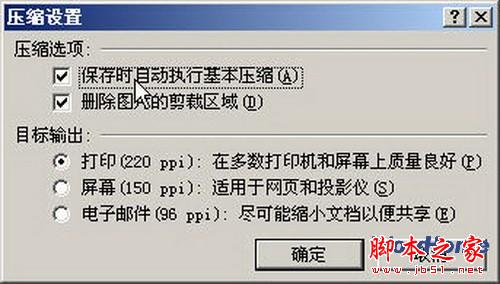 第3步,打开Word 2007“压缩设置”对话框,选中“保存时自动执行基本压缩”复选框,并单击“确定”按钮即可,如图所示。