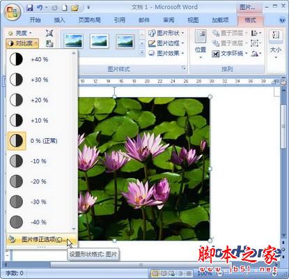 1.在Word 2007“图片工具”功能区设置图片对比度