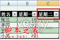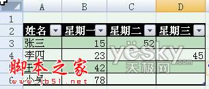 Excel 2007自动添加表格字段标题功能生效——标题栏自动出现了“星期二”。