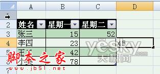现在我们再在表格横向扩展区域输入一个数字45,如下图。(注意:输入数字的时候应该紧挨已有数据列,不要跳列输入)