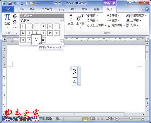 第2步,在“公式工具/设计”功能区的“符号”分组中单击“其他”按钮打开符号面板,然后单击顶部的下拉三角按钮。在打开的下拉菜单中选择“几何学”选项,并在打开的几何学符号面板中选择所需的几何学符号即可,如图2所示。