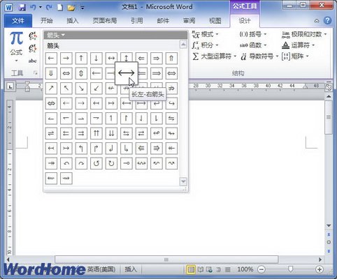 第2步,在“公式工具/设计”功能区的“符号”分组中单击“其他”按钮打开符号面板,然后单击顶部的下拉三角按钮。在打开的下拉菜单中选择“箭头”选项,并在打开的箭头符号面板中选择所需的箭头符号即可,如图2所示。