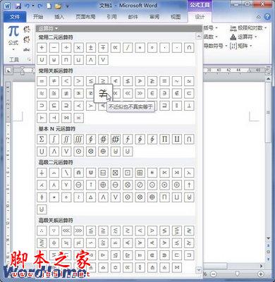 第2步,在“公式工具/设计”功能区的“符号”分组中单击“其他”按钮打开符号面板,然后单击顶部的下拉三角按钮。在打开的下拉菜单中选择“运算符”选项,并在打开的运算符面板中选择所需的运算符即可,如图2所示。