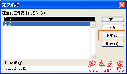 这时显示【定义名称】对话框,在【在当前工作簿中的名称】框里输入名字,点击【添加】按钮,然后单击【确定】按钮,这时就对刚才选中的单元格重新命名为“总分”了。