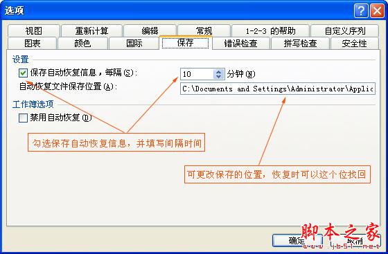 步骤二、选择【保存】选项卡,勾选中【保存自动恢复信息,每隔】,然后在后面的文本框设置自动保存的间隔时间,同时可更改下面的【自动恢复文件的保存位置】,以便如果发生突然情况,可以通过excel自动保存路径到该目录下恢复。