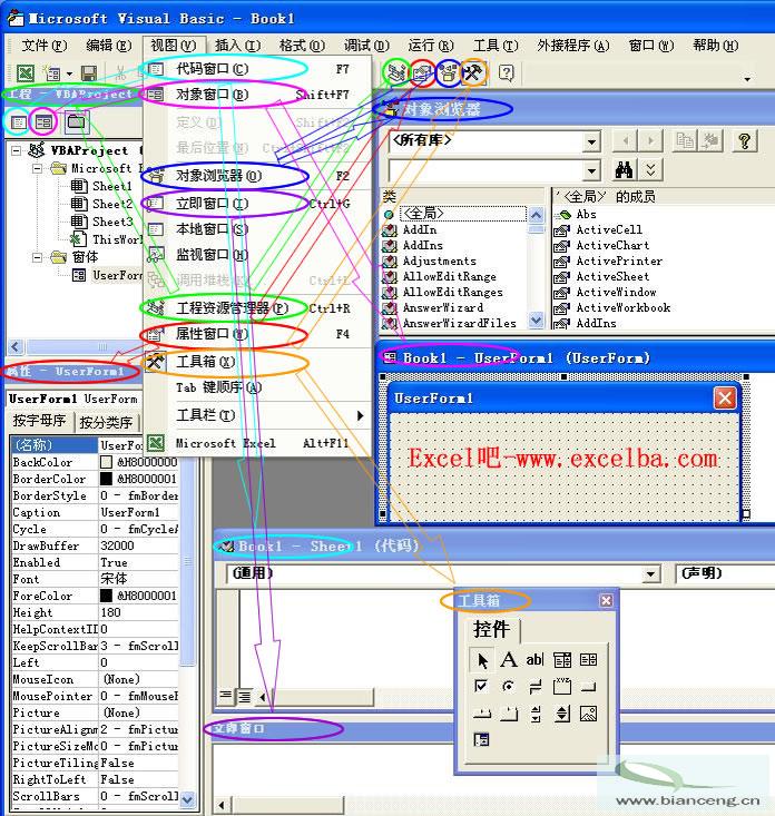 VBE的七个常用窗口的用途上个文章已用图片给出了七个常用窗口的图片,图片中可以很清楚地看到对应的菜单与工具栏所在的位置,从视觉是认识这七个窗口,下面内容也就好说明一点。