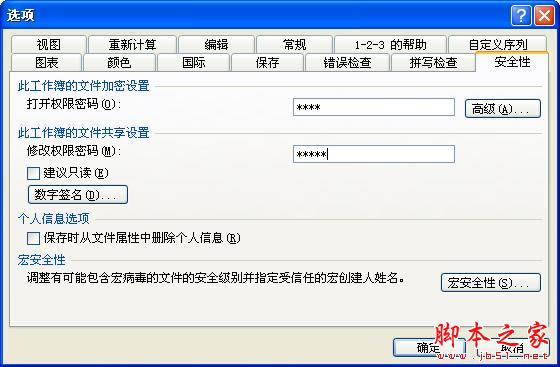 在弹出的“选项”对话框中选择“安全性”选项卡,可以为当前工作簿设置“打开权限密码”及“修改权限密码”,设置完成后单击“确定”按钮,如图所示: