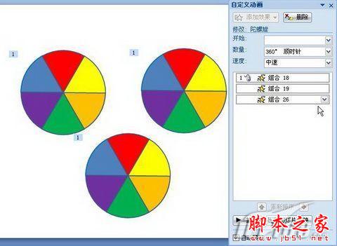 对三个风车的动画分别设置不同的旋转速度、旋转方向。完成后进行放映,就可以看到预期的效果了。