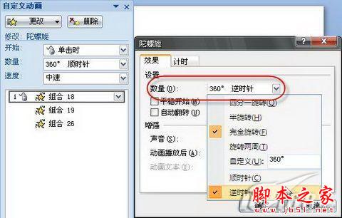 现在,分别选中动画任务中的一个,点击其右侧的下拉按钮,在弹出菜单中点击“效果选项”命令,打开“陀螺旋”对话框。点击“效果”选项卡,然后在“数量”后的下拉列表中选择“逆时针”或“顺时针”,如图6所示。再点击“计时”选项卡,在“速度”下拉列表中选择“慢速”、“中速”或“快速”等速度设置。在“重复”下拉列表中指定旋转重复的次数,也可以选择“直到下一次单击”或“直到幻灯片末尾”。
