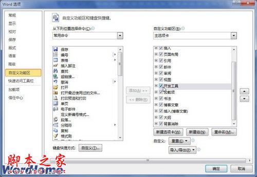 第2步,在打开的“Word选项”对话框中切换到“自定义功能区”选项卡,在“自定义功能区”区域的“主选项卡”列表中选中“开发工具”复选框,并单击“确定”按钮,如图2所示。