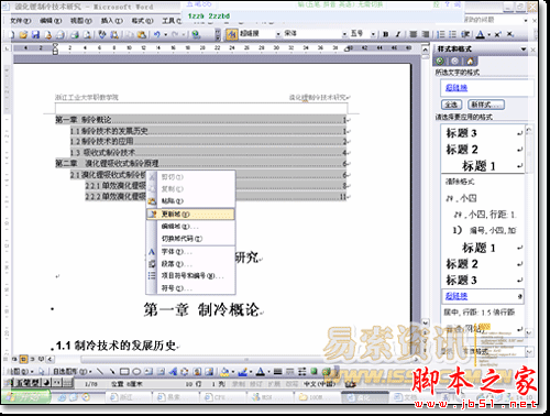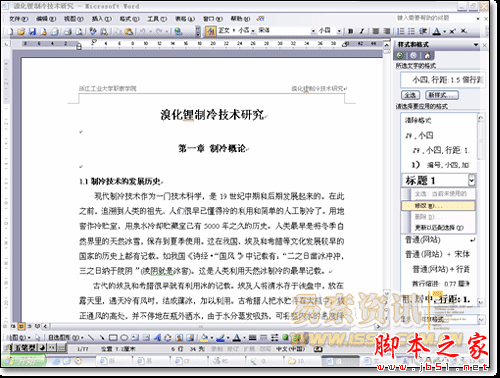 2.出现右边的一条“样式格式”栏,这里面主要就是用到标题1,标题2,标题3。把标题1,标题2,标题3分别应用到文中各个章节的标题上。例如:文中的“第一章 制冷概论”我们就需要用标题1定义。而“1.1制冷技术的发展历史”就用标题2定义。如果有1.1.1×××那就用标题3来定义。