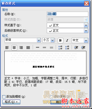 3.当然标题1,标题2,标题3的属性(如字体大小,居中,加粗,等等)可以自行修改的。修改方法:右键点击“标题1”选“修改”,会弹出修改菜单,您可以根据自己的要求自行修改。
