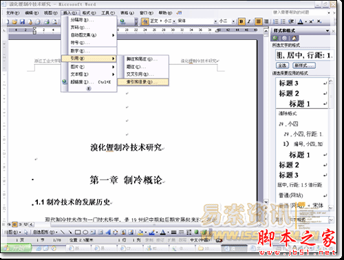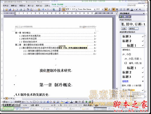 4.用标题1,2,3分别去定义文中的每一章节。定义时很方便,只要把光标点到“第一章 制冷概论”上,然后用鼠标左键点一下右边的标题1,就定义好了;同样方法用标题2,3定义1.1;1.1.1;依此类推,第二章,第三章也这样定义,直到全文节尾。