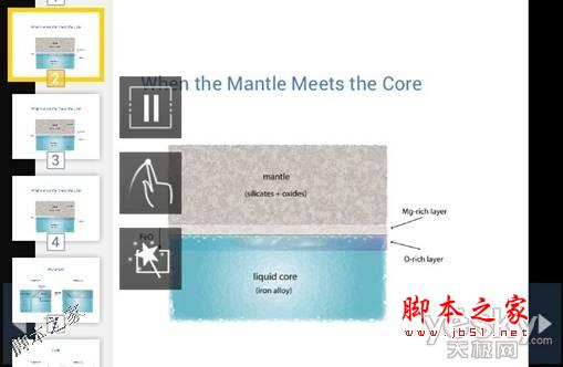 需要特别说明的是激光笔翻页/标注功能。在激光笔翻页模式中,只需轻轻向左或向右滑动手指就能实现向相应方向翻页的目的。而在激光笔标注模式中,可以通过页面左下方和右下方的箭头翻页,这时激光笔的作用则是通过手指滑动的痕迹来标注演讲的重点。