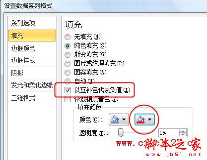 2、双击图表中的数据系列,弹出“设置数据系列格式”对话框,选择“填充”。在右侧区域中选择“纯色填充”,并勾选“以互补色代表负值”。这时下部的“填充颜色”区域中会增加一个颜色选择按钮,单击右侧的颜色选择按钮选择一种颜色,如红色,然后关闭对话框。