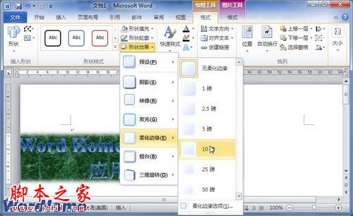 第3步,打开形状效果菜单,指向“柔化边缘”选项。在打开的柔化边缘效果列表中任意一种柔化边缘效果,则Word2010文档中的艺术字将实时显示最终效果。确定使用某一种柔化边缘效果后单击该效果即可。