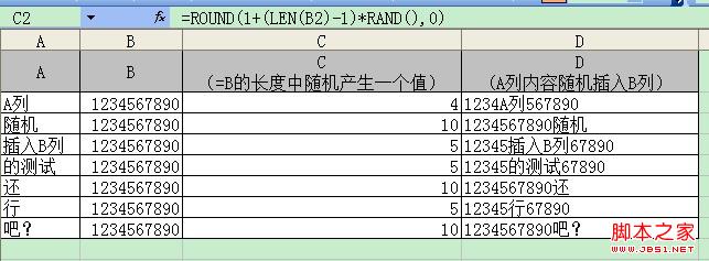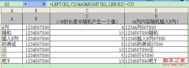 =LEFT(B列内容,B列随机位置) & A列内容 & RIGHT(B列内容,LEN(B列内容)-B列随机位置)