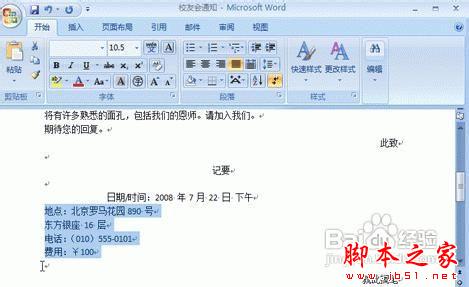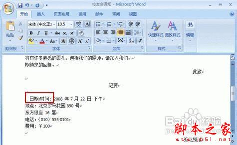 6、单击“开始”选项卡上的“段落”中的按钮(“增加缩进量”按钮)。单击该按钮数次,直到所选文本与要设置缩进的“日期”行的起始位置对齐。