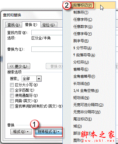 按一下特殊格式按钮,选择段落标记;