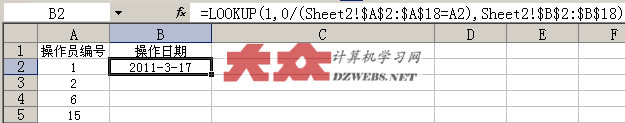 如下图,在Sheet2中,我们存放两列数据,A列为操作员的编号,B列为操作员的操作日期。
