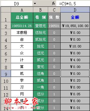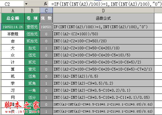 上表中,A2给出一个金额数,然后,在B列给出金额的不同币种,C列算出各由多少张的壹佰元、伍拾元、贰拾元、拾元、伍元、贰元、壹元、伍角、贰角、一角、伍分、贰分、壹分组成。