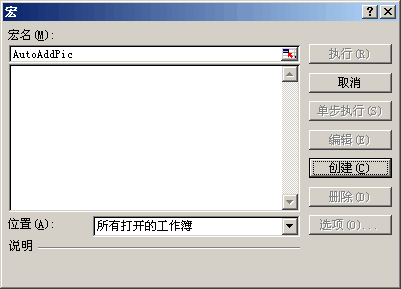上图中,宏名那里,输入 AutoAddPic ,然后,点击“创建”按钮,弹出代码输入窗口,如下图。