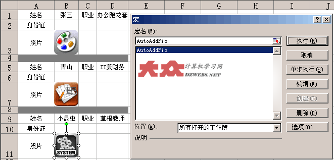 选中上面所创建的宏名 AutoAddPic ,然后,点击“执行”按钮,这样,Excel就会根据每个姓名找到所对应的照片,将照片插入到每一个人所对应的相应的单元格。