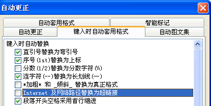 上图中,切换到“键入时自动套用格式”选项卡,之后在其下方找到“Internet 及网络路径替换为超链接”,将其前面的√去掉即可。