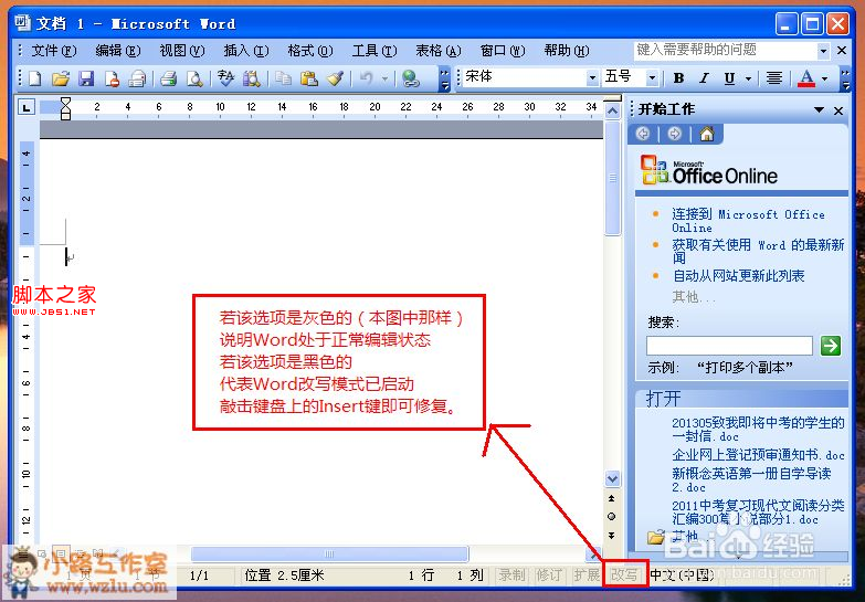 因此,要撤销改写模式,回复正常编辑状态,再次敲击一下Insert键就可以了。你也可以单击图示位置的改写两字,让它变成灰色。