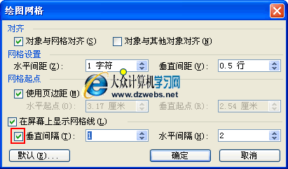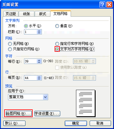 上图中,首先选择“文档网格”,之后在选择“文字对齐字符网格”;最后,再点击“绘图网格”按钮进行下一步的设置。弹出如下图对话框。